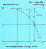 Na obr. 1 je znázorněn průběh těchto teplot podle obsahu uhlíku u nelegované oceli. Pásmo rozptylu je znázorněno jako vyšrafovaná plocha. Podle obr. 1 dosahuje Mf při obsahu uhlíku C = 0,5 % hm. teploty okolí. U ocelí s obsahem C > 0,5 % hm. dochází v důsledku ještě neukončeného vytváření martenzitu (při zchlazení na teplotu okolí) ke vzniku zbytkového austenitu (20–30 % hmot. u nástrojových ocelí).